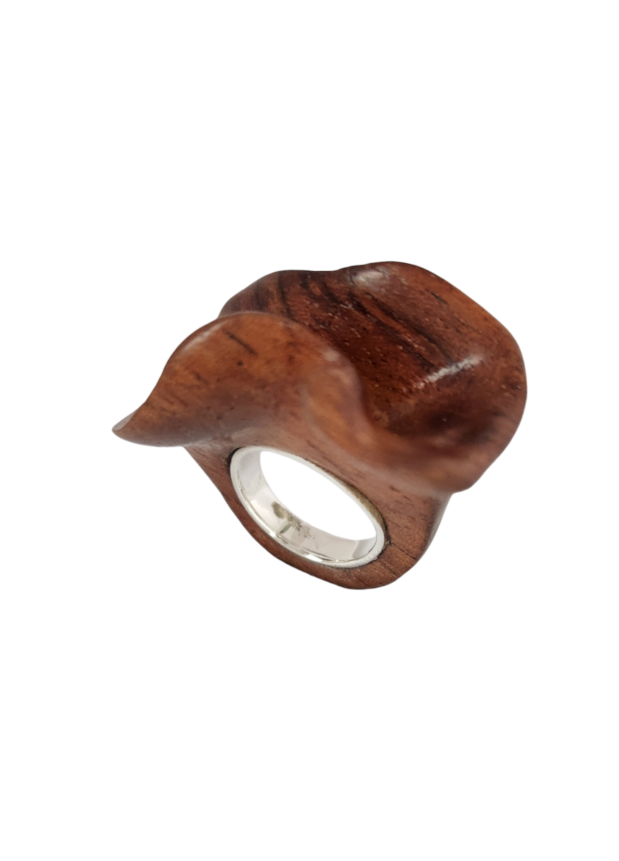 Anel artesanal em Cedro e Prata da Linha Escultórica. Uma joia autoral que une madeira leve e metal nobre, esculpida à mão com acabamento poético. Natureza e arte em forma de adorno único.
